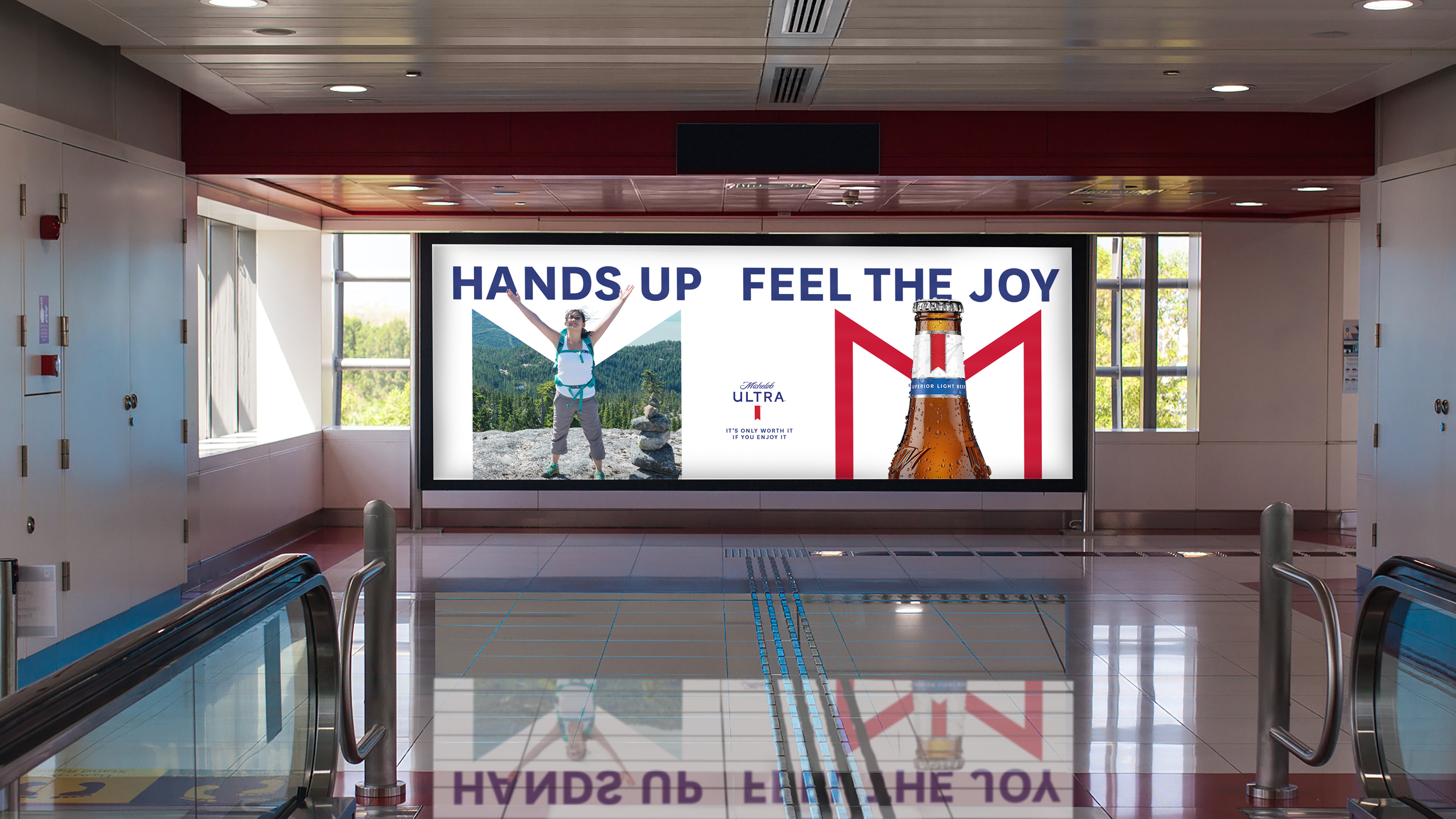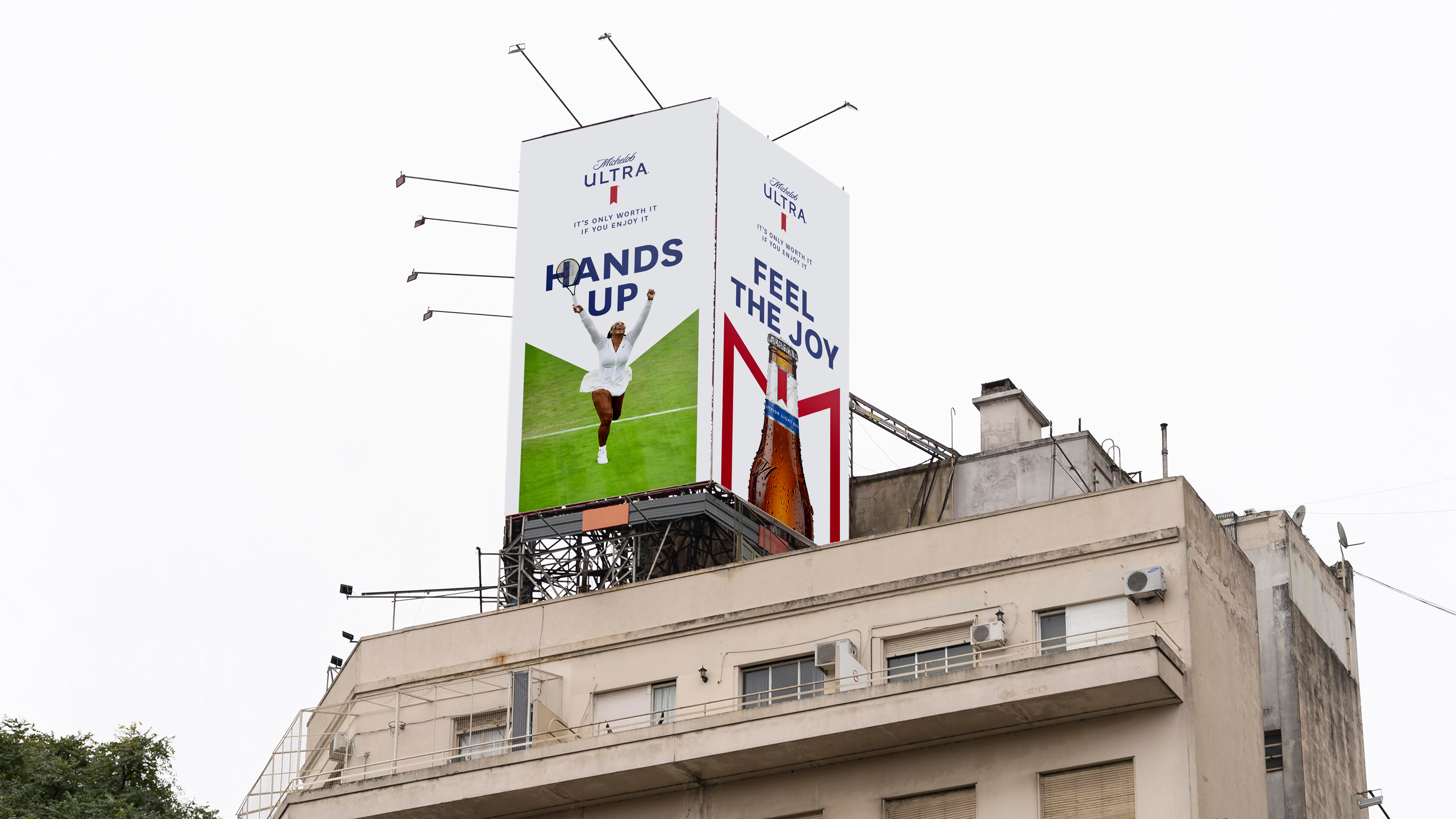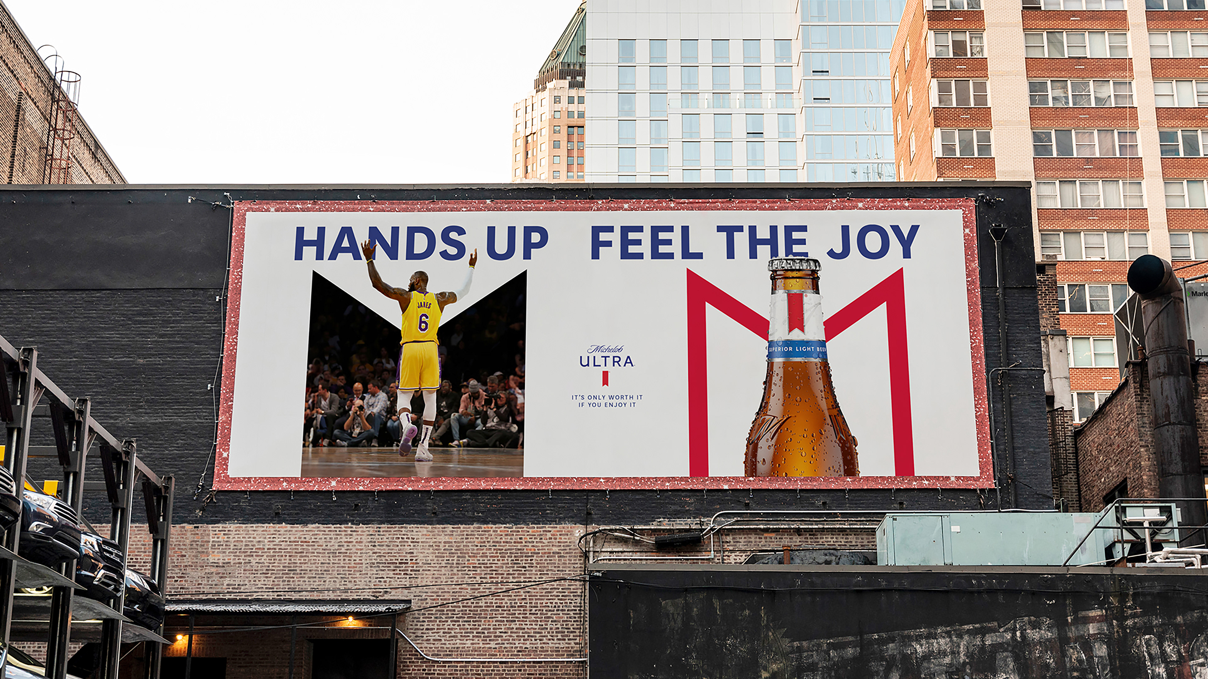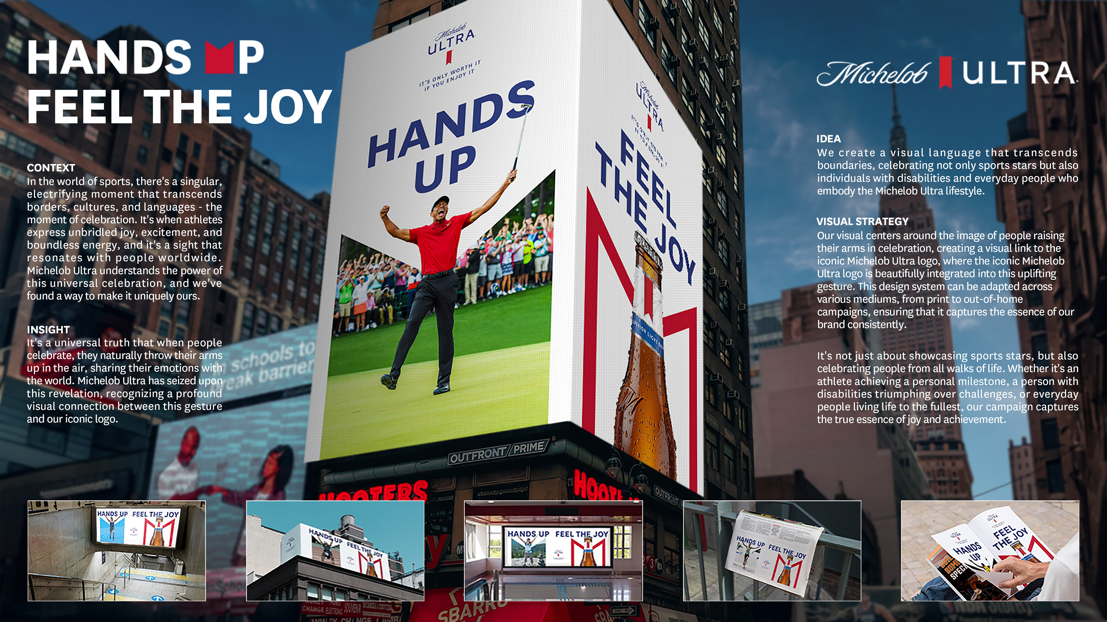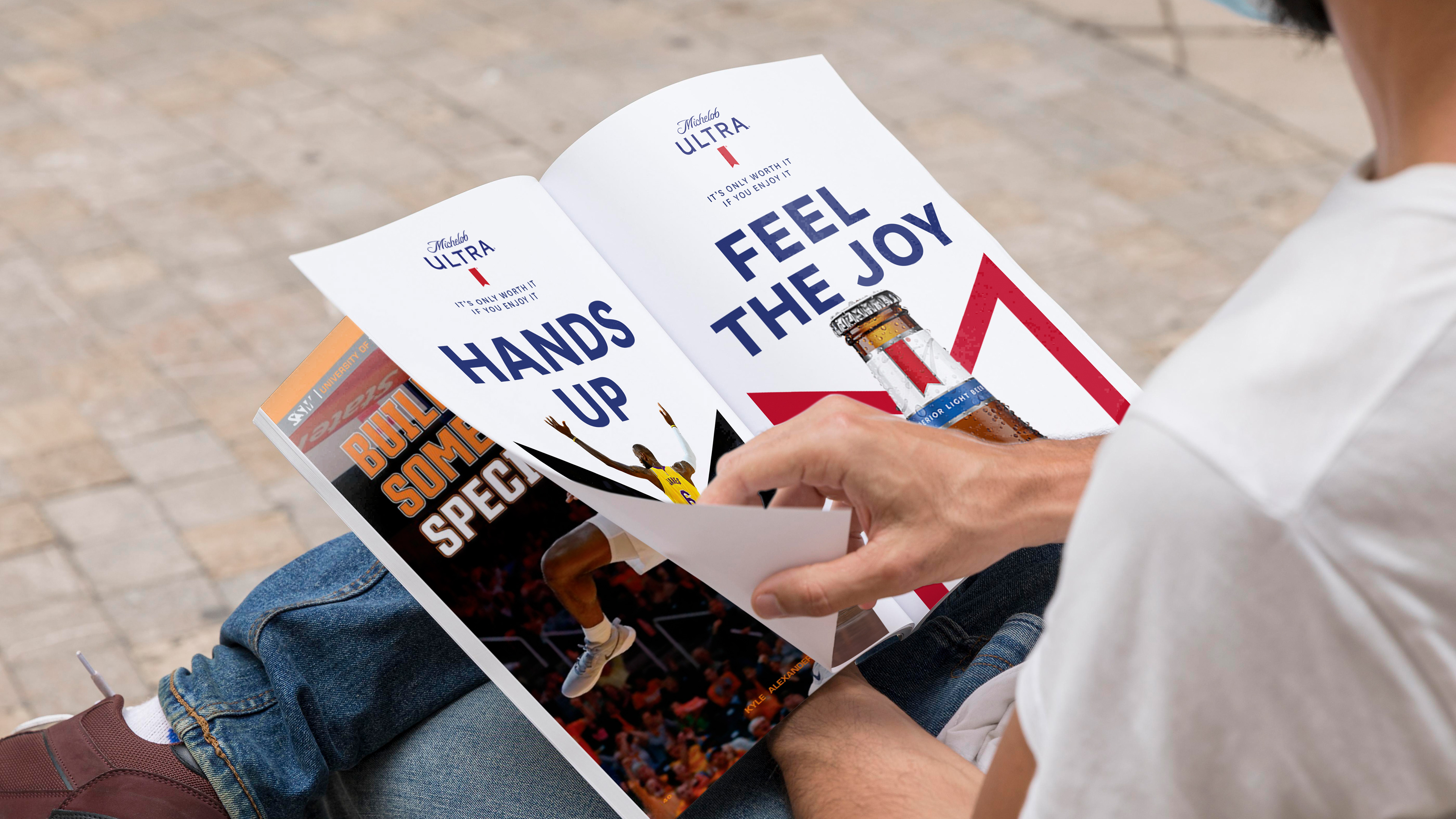 우리의 비주얼은 사람들이 축하의 순간에 팔을 들어올리는 이미지를 중심으로 하여, 이 uplifting 제스처와 미켈로브 울트라 로고가 아름답게 통합된 시각적 연결을 만듭니다. 이 디자인 시스템은 인쇄물부터 옥외 캠페인까지 다양한 매체에 적응될 수 있으며, 우리 브랜드의 본질을 일관되게 포착합니다.