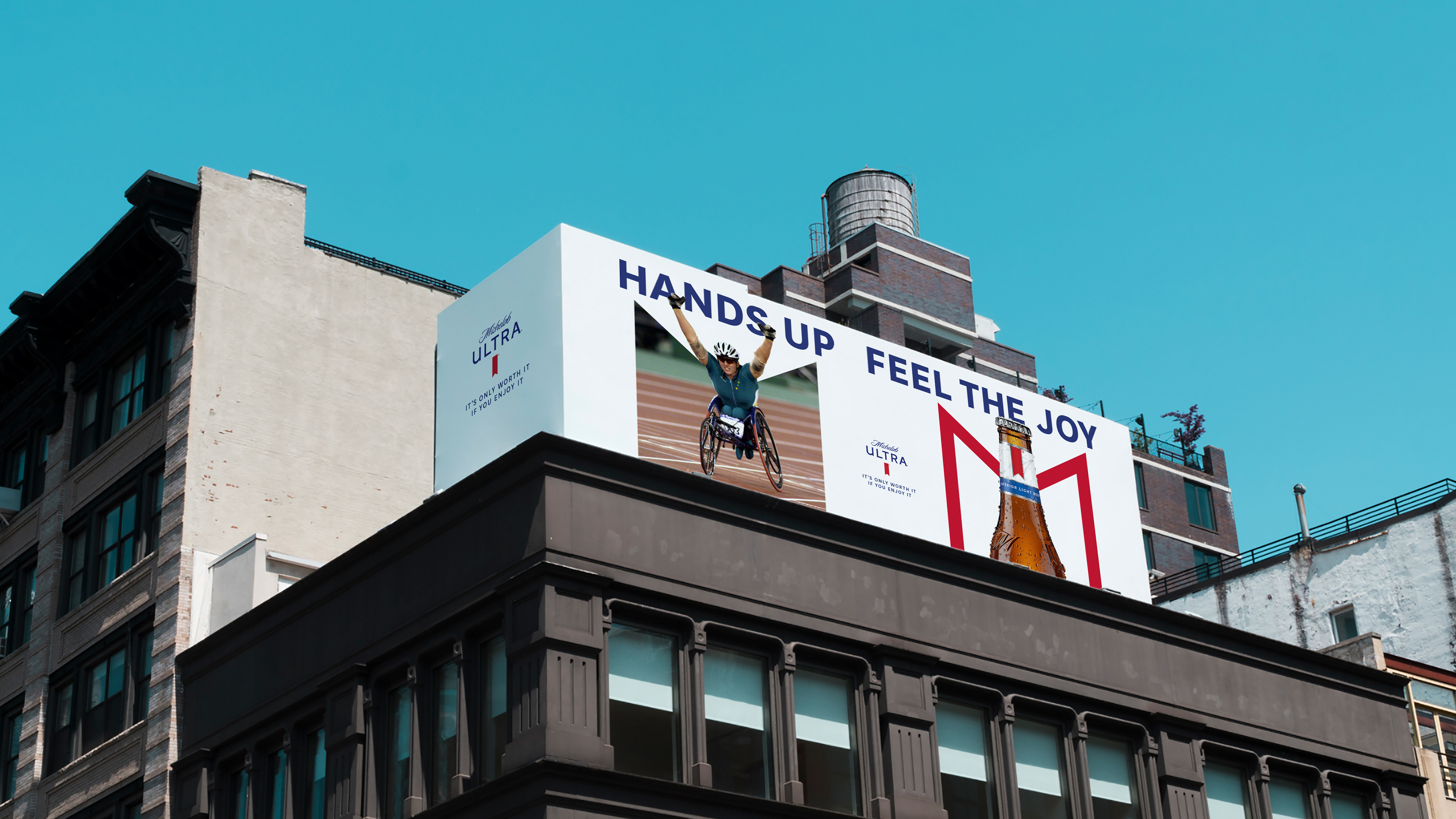 그래서 우리는 국경을 초월하는 시각적 언어를 만들어, 스포츠 스타뿐만 아니라 장애인을 가진 사람들과 미켈로브 울트라 라이프스타일을 구현하는 일반인들도 함께 축하합니다.