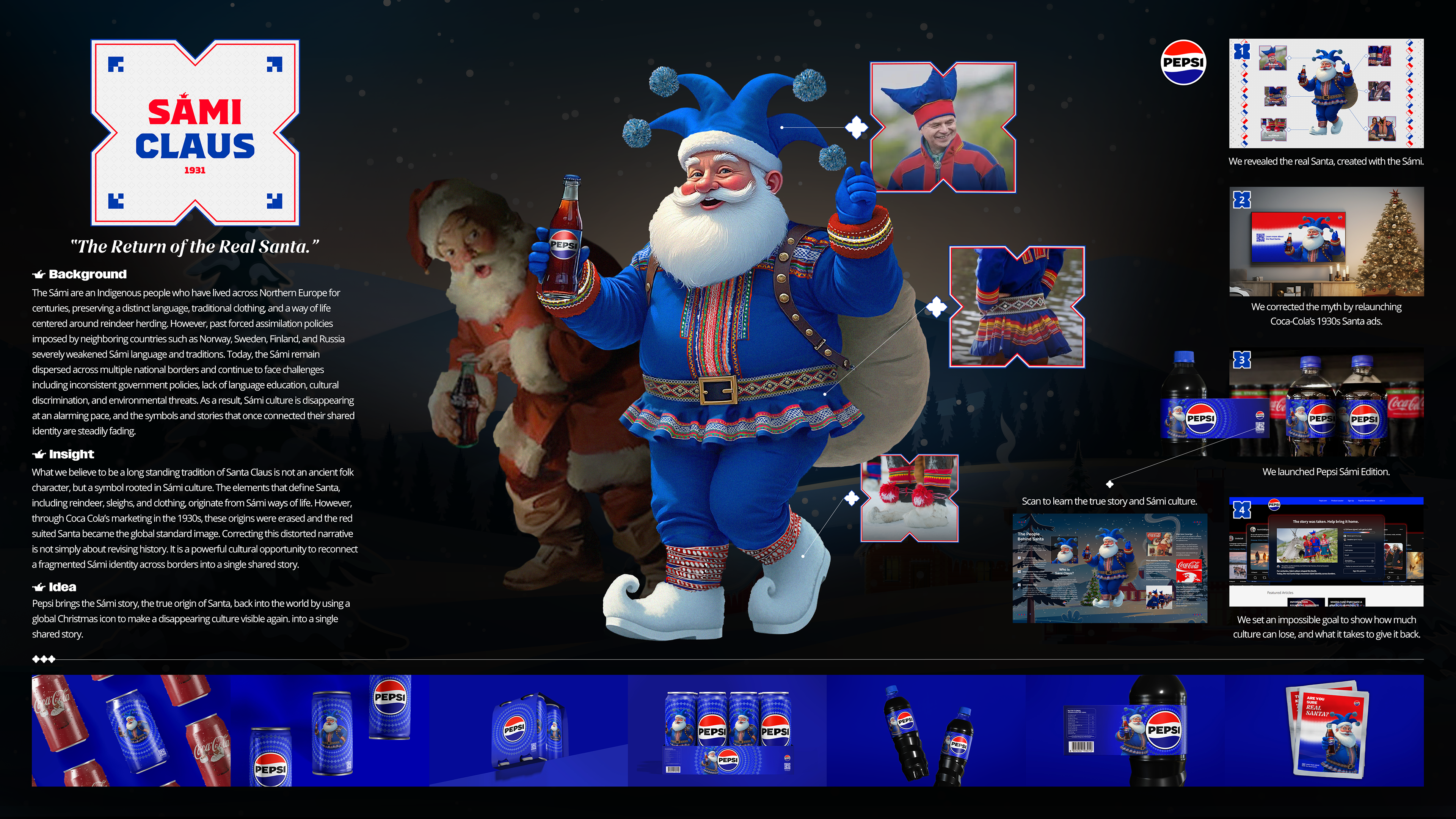 펩시는 글로벌 크리스마스 아이콘을 통해 사미족의 이야기, 그리고 산타의 진정한 기원을 다시 세상에 알리고자 합니다. 이를 통해 사라져가는 문화를 다시 가시화하고, 분절된 정체성을 하나의 공동된 이야기로 이어가고자 합니다.